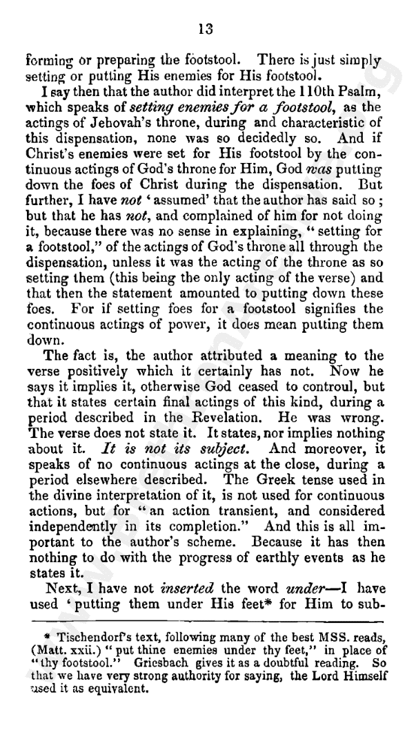 I say then that the author did interpret Psalm 110, which speaks of setting enemies for a footstool, as the actings of Jehovah's throne, during and characteristic of this dispensation: none was so decidedly so. And if Christ's enemies were set for His footstool by the continuous actings of God's throne for Him, God was putting down the foes of Christ during the dispensation. But, further, I have not "assumed" that the author has said so; but that he has not, and complained of him for not doing it, because there was no sense in explaining "setting for a footstool" as the actings of God's throne all through the dispensation, unless it was the acting of the throne as so setting them (this being the only acting of the verse), and that then the statement amounted to putting down these foes. For if setting foes for a footstool signifies the continuous actings of power, it does mean putting them down.