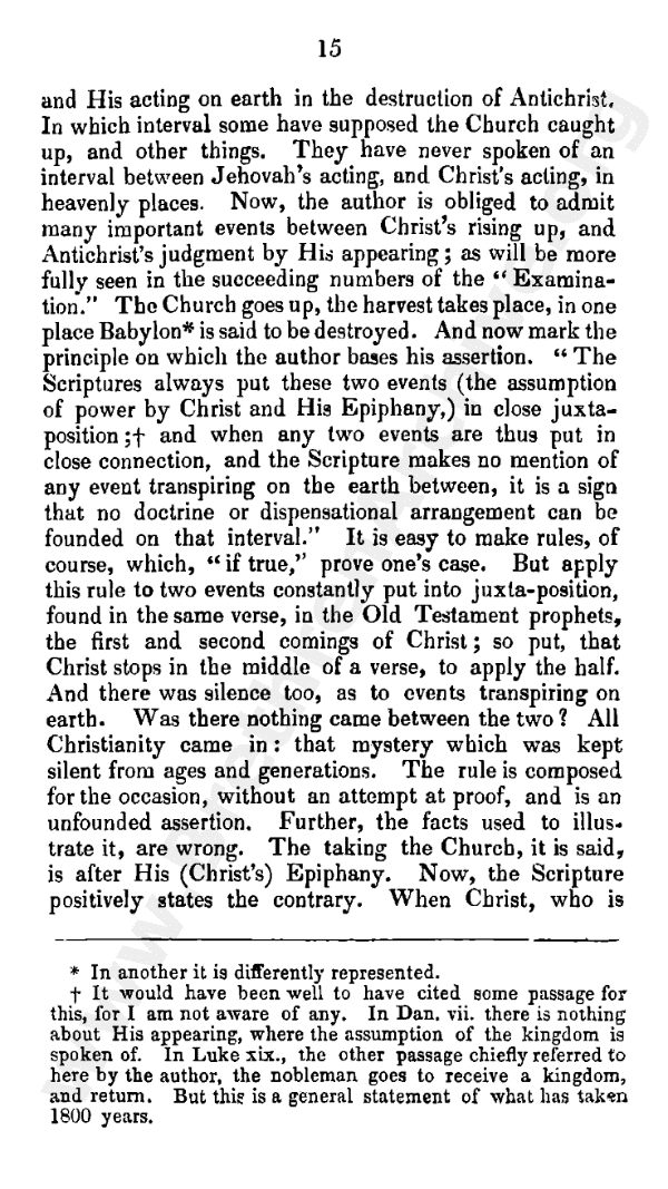 And now mark the principle on which the author bases his assertion. "The scriptures always put these two events (the assumption of power by Christ and His epiphany) in close juxta-position;* and when any two events are thus put in close connection, and the scripture makes no mention of any event transpiring on the earth between, it is a sign that no doctrine or dispensational arrangement can be founded on that interval." It is easy to make rules, of course, which "if true," prove one's case. But apply this rule in two events constantly put into juxta-position, found in the same verse, in the Old Testament prophets, the first and second comings of Christ - so put, that Christ stops in the middle of a verse to apply the half. And there was silence too as to events transpiring on earth. Was there nothing came between the two? All Christianity came in - that mystery which was kept silent from ages and generations. The rule is composed for the occasion, without an attempt at proof, and is an unfounded assertion. Further, the facts used to illustrate it are wrong. The taking the church, it is said, is after His (Christ's) epiphany. Now, the scripture positively states the contrary. When Christ, who is our life, shall appear, we shall appear with Him. And therefore the taking of the church cannot be after His epiphany - epiphany being used here for appearing. Besides, Antichrist is destroyed by the epiphany of His presence. And the author himself owns that the taking of the church, or harvest, takes place before this.
