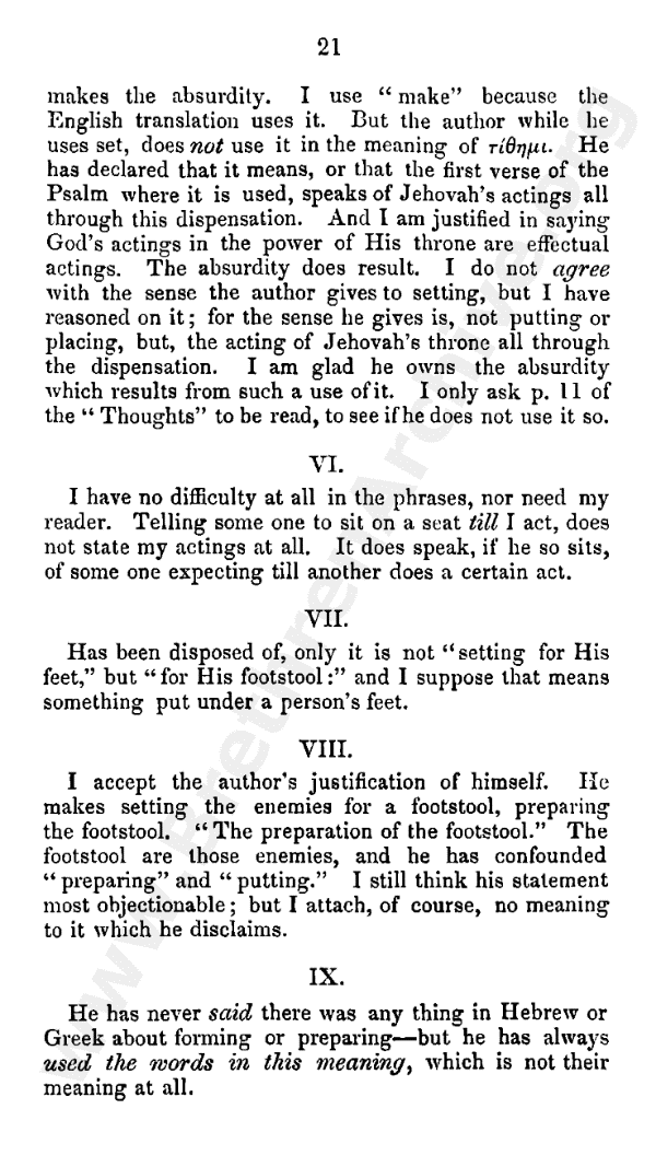 5. My answer to this note is very simple. It is precisely the sense the author has attributed to setting which makes the absurdity. I use "make" because the English translation uses it. But the author, while he uses set, does not use it in the meaning of the Greek. He has declared that it means, or that verse I of the Psalm where it is used speaks of, Jehovah's actings all through this dispensation. And I am justified in saying God's actings in the power of His throne are effectual actings. The absurdity does result. I do not agree with the sense the author gives to setting, but I have reasoned on it; for the sense he gives is, not putting or placing, but, the acting of Jehovah's throne all through the dispensation. I am glad he owns the absurdity which results from such a use of it. I only ask page 11 of the "Thoughts" to be read to see if he does not use it so.
