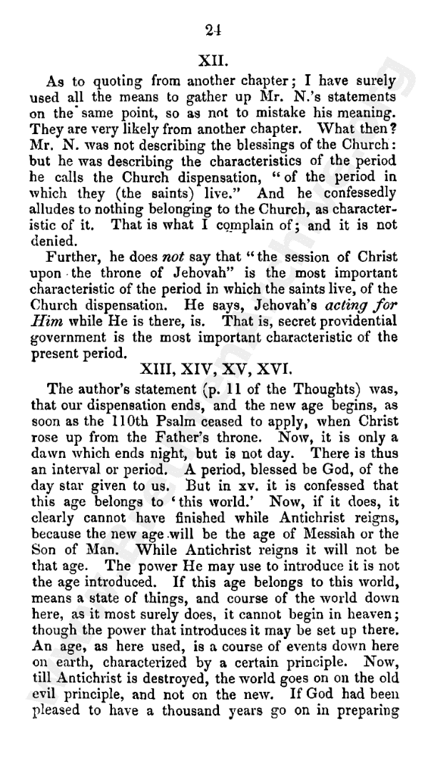 12. As to quoting from another chapter; I have surely used all the means to gather up Mr N.'s statements on the same point, so as not to mistake his meaning. They are very likely from another chapter. What then? Mr. N. was not describing the blessings of the church; but he was describing the characteristics of the period he calls the church dispensation - "of the period in which they (the saints) live." And he confessedly alludes to nothing belonging to the church, as characteristic of it. That is what I complain of; and it is not denied.