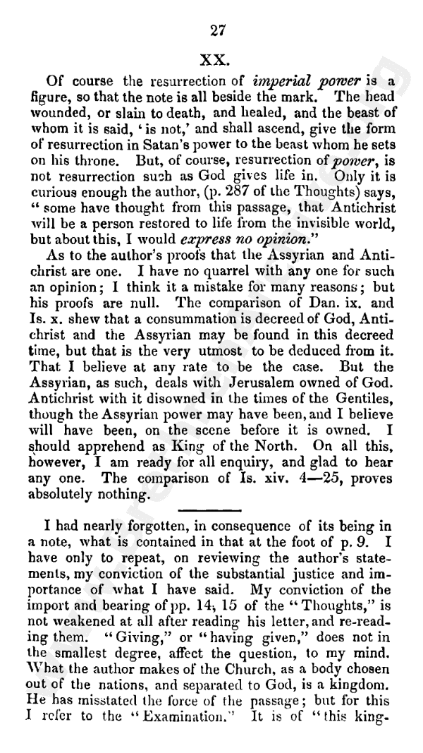 Surely this last is an important doctrine or dispensational arrangement. We have only to compare pages 22 and 25, and we shall see the statements of page 22 subverted, and in the very point on which the author has opposed the views of others, the intermediate rapture of the church. The "Thoughts" spoke of no interval. The statement of page 11 allows of none. Now in page 22 it is not appreciable. In page 25 it ends in heaven, on earth, and by Christ's acting in His new power for the first time on the nations, and becomes appreciable by that which the views of others said it was appreciable - the rapture of the church. The length of the interval may be discussed afterwards. The principle of interpretation and the statements made are abandoned.* It may fairly then be questioned whether other events may not come in too. In one place the author states the destruction of Babylon by Christ.** Others may see other events which he does not. The age is ended above when it is not ended below, according to the author.
