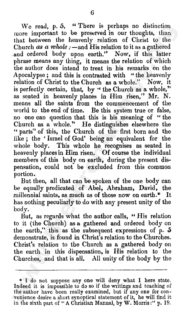 We read (page 5), "There is perhaps no distinction more important to be preserved in our thoughts, than that between the heavenly relation of Christ to the church as a whole, and His relation to it as a gathered and ordered body upon earth." Now, if this latter phrase means anything, it means the relation of which the author does intend to treat in his remarks on the Apocalypse; and this is contrasted with "the heavenly relation of Christ to the church as a whole." Now, it is perfectly certain, that, by "the church as a whole," as "seated in heavenly places in Him risen," Mr. N. means all the saints from the commencement of the world to the end of time. Be this system true or false, no one can question that this is his meaning of "the church as a whole." He distinguishes elsewhere the "parts" of this, the church of the firstborn, and the like (the 'Israel of God' being an equivalent for the whole body). This whole he recognises as seated in heavenly places in Him risen. Of course the individual members of this body on earth, during the present dispensation, could not be excluded from this common portion.