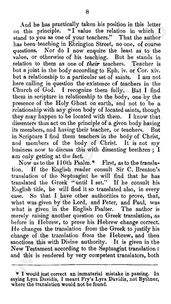As to the quotation from page 11 of my tract in page 20, the language is not drawn from Psalm 8, and the sentiment does not belong to verse 2 of Psalm 110. And it is so far from being true that I have not distinguished between verses 1 and 2, that I have argued at length (page 30 - the passage the author has just been commenting on), that there must be a considerable interval, such that all that regards the church will have happened between the two; so that the heavenly part of Christ's actings is omitted in the psalm. And this last is in italics, to shew the importance of the events which happen in the interval. And I still judge that "the authority of His power giving them up to be trampled upon by Christ" is not verse 2, but verse I. For this simple reason, that verse 2 speaks of sending the rod of Christ's power out of Zion; verse I speaks of His (God's) setting them for Christ's footstool (that is, of His power giving them up to be trampled on). Further, the question is not whether Jehovah has been acting to bring about Christ's glory; no Christian doubts it.