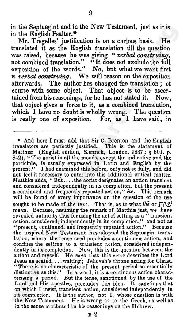 {**And here I must add that Sir C. Brenton and the English translators are perfectly justified. This is the statement of Matthiae (English edition, Kenrich, London, 1837, 501, p. 842), "The aorist in all the moods except the indicative and the participle, is usually expressed in Latin and English by the present." I had examined this before, only not so fully, and did not feel it necessary to enter into this additional critical matter. Matthiae adds, "But . . . the aorist designates an action transient and considered independently in its completion, but the present a continued and frequently repeated action," etc. This remark will be found of every importance on the question of the use sought to be made of the text - that is, as to what the Greek aorist for "I make" (Heb. 1: 13) or the Hebrew for this in Psalm 110: 1, means. Because, assuming the remark of Matthiae just, we have revealed authority thus for using the act of setting as a "transient action, considered independently in its completion," and not as "present, continued, and frequently repeated action." Because the inspired New Testament has adopted the Septuagint translation, where the tense used precludes a continuous action, and confines the setting to a transient action, considered independently in its completion. Now, this is the question between the author and myself He says that this verse describes the Lord Jesus as seated . . . waiting, Jehovah's throne acting for Christ. "There is no characteristic of the present period so essentially distinctive as this." In a word, it is a continuous action characterising a period. But the tense, sanctioned by the use of the Lord and His apostles, precludes this idea. It sanctions that on which I insist - transient action, considered independently in its completion. It is the author, not I, whose question is with the New Testament. He is wrong as to the Greek, as well as in the sense attributed in his reasonings on the Hebrew.}
