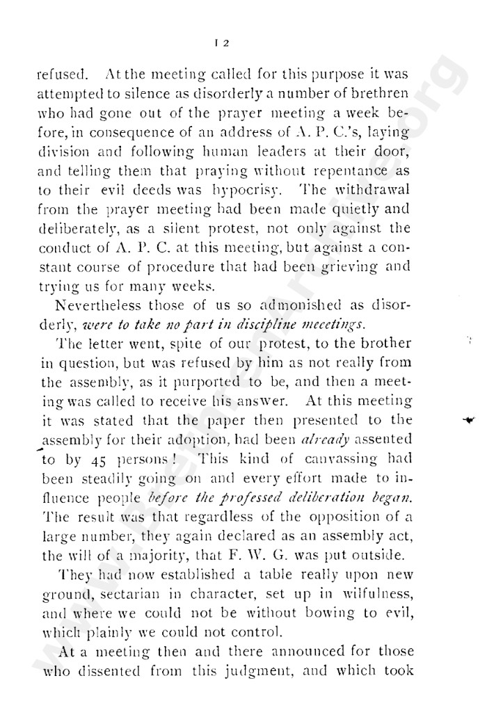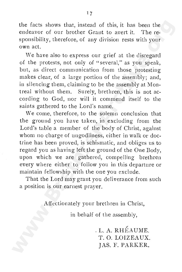 A collection of papers that gives good insight into what is known as the Grant division. Thankfully in the reunion between the Grant and Kelly-Lowe brethren, the KLC brethren were free to acknowledge this act was 'sin and unrighteousness'. Amazingly the TW brethren will still hold this was 'of God', but their ecclesiastical position necessitates them to and shows the falsehood of the whole thing. Particularly liked this on the last page: "At the judgement-seat of Christ you cannot, as so many of you do now, shelter yourselves by saying the assembly decided, and you could not but concur. This may quiet your conscience here, but there "every one of us shall give account of himself to God." "