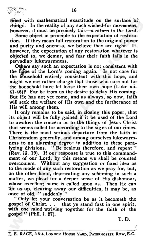 Obviously T. D. was from a “Kelly” background (F. E. Race as publisher points to this). Thus it is quite probably that T. D. is Theo Davis from Blackheath. He had a part in the correspondence between the “Kelly” and the “Lowe” Brethren in the 1920th. Noel’s history (vol.II, pages 745 – 750) has only his initials “T. D.” but a German Letter of R. Brockhaus from July 1926 gives his full name. Theo Davis was a regular contributor to “Bible Monthly” (as “T. D.”, but once with full name: vol. 3 [1923], p. 46), often with verses. I have the copy of a photograph which shows Davis together with H. Wreford and W. J. Hocking. Thy Precepts, vol. 18, #3 [May/June 2003], page 84, mentions a text by Davis in a booklet (?) with the title: “On the Human Personality of Christ” – probably against F. E. Ravens heresies. Do you have access to this text? Christian greetings Martin