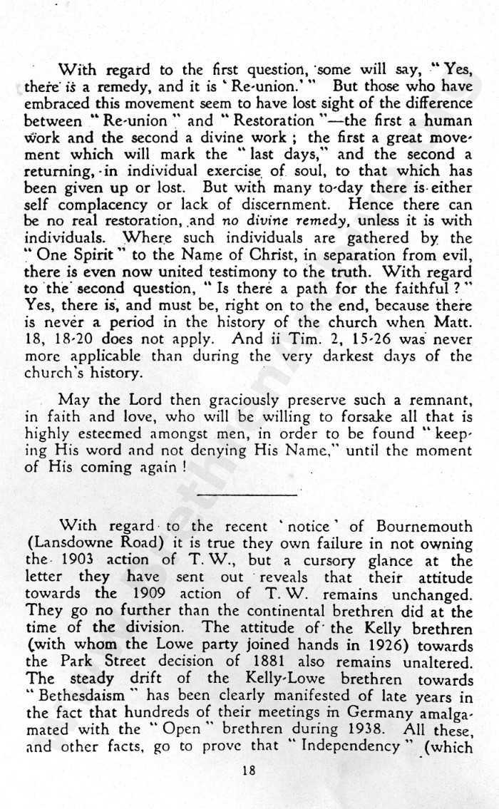 The notion exists in the minds of some that they are not, all the others being in divided groups, or in an amalgamation of such groups. They regard it that they alone are truly gathered together to the Lord's name, and since there is but the one Lord's table, it is found in their midst.