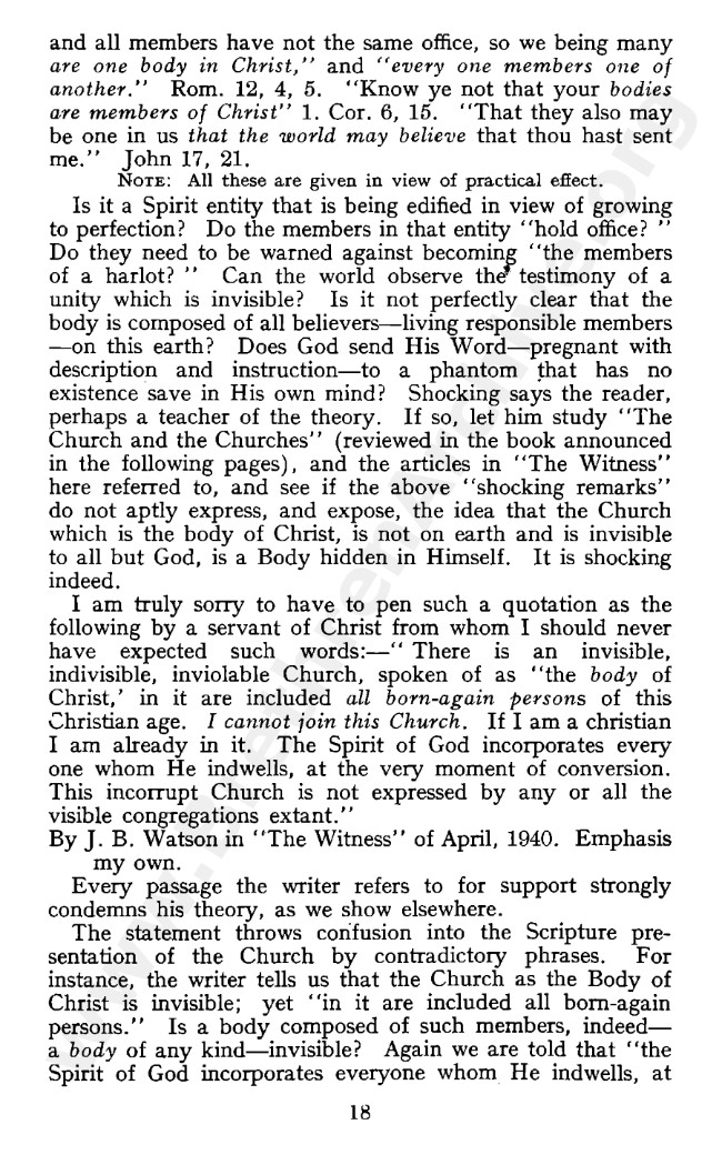 For example: "Almost without question, no subject that can be taught about the church and the churches is more relevant to today’s needs than this distinction between (sic) the church which is His body and a local church of God on earth … There are as many as forty differences … Being in it is distinct from being in the body." (Norman Crawford, Assembly Truth, pp. 14 and 18.)
