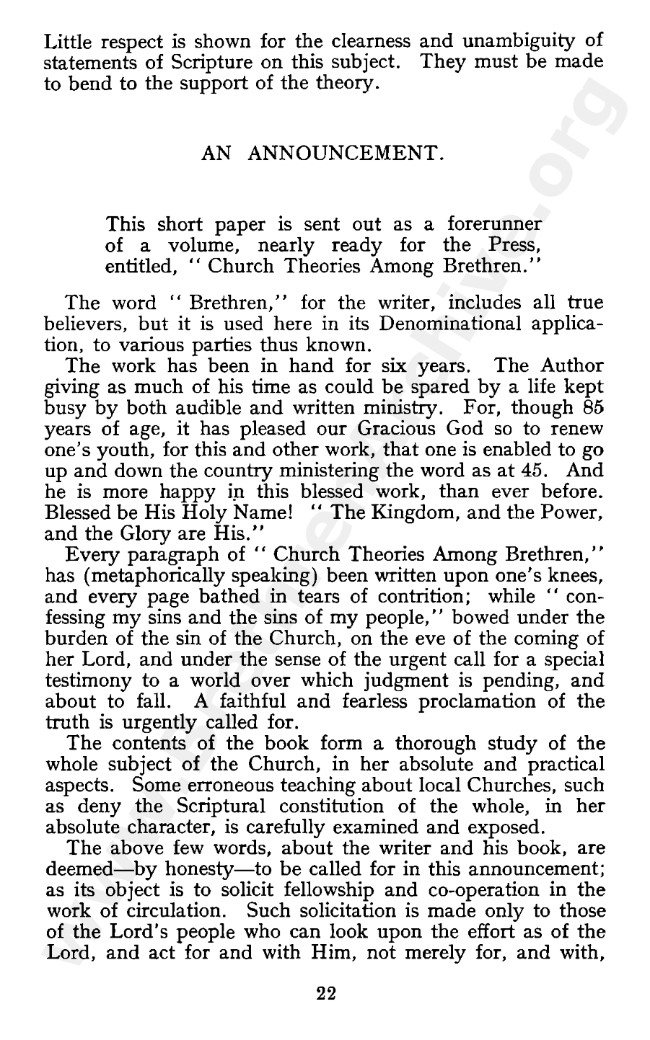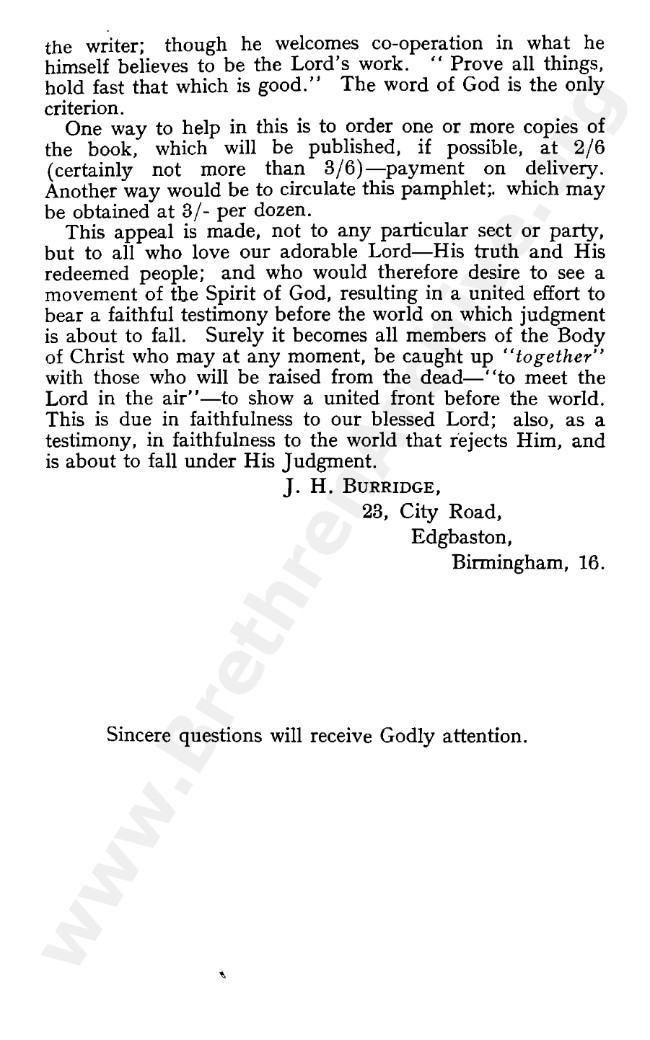 This book is one among several others which J H Burridge wrote in response to the influx of “Needed Truth” teachings then gaining rapid support among the Open Brethren, this being the so-called “tightening process” as sometimes called.