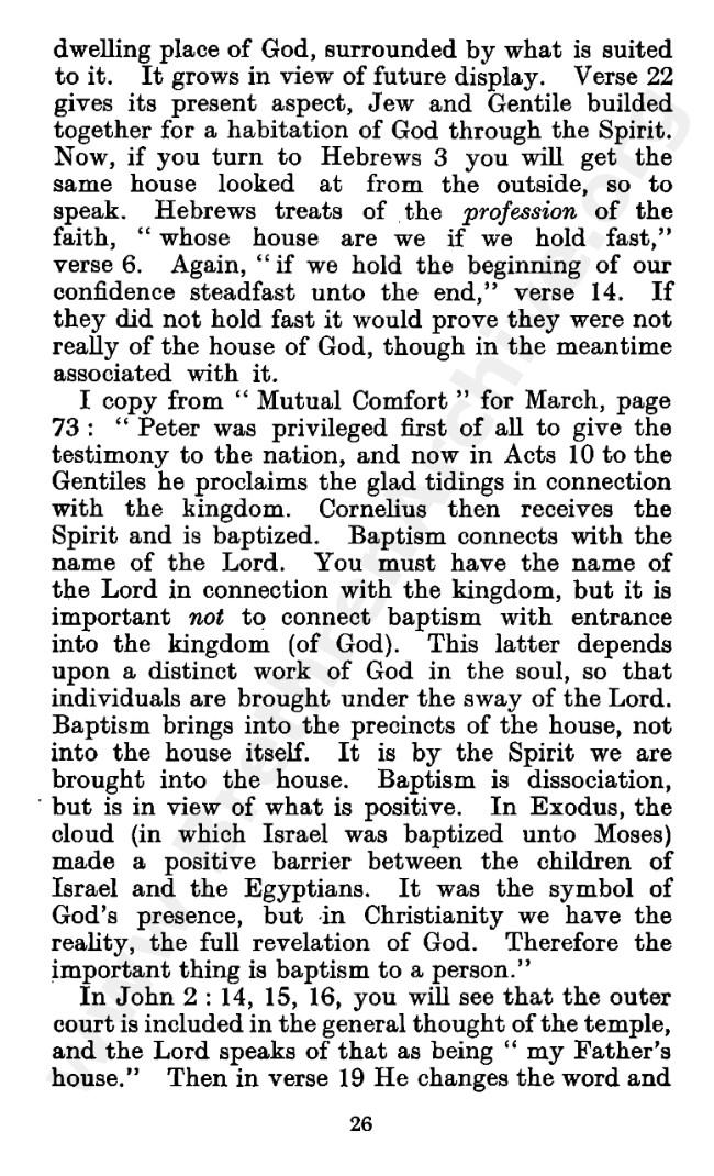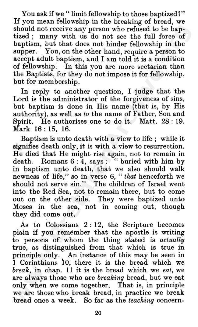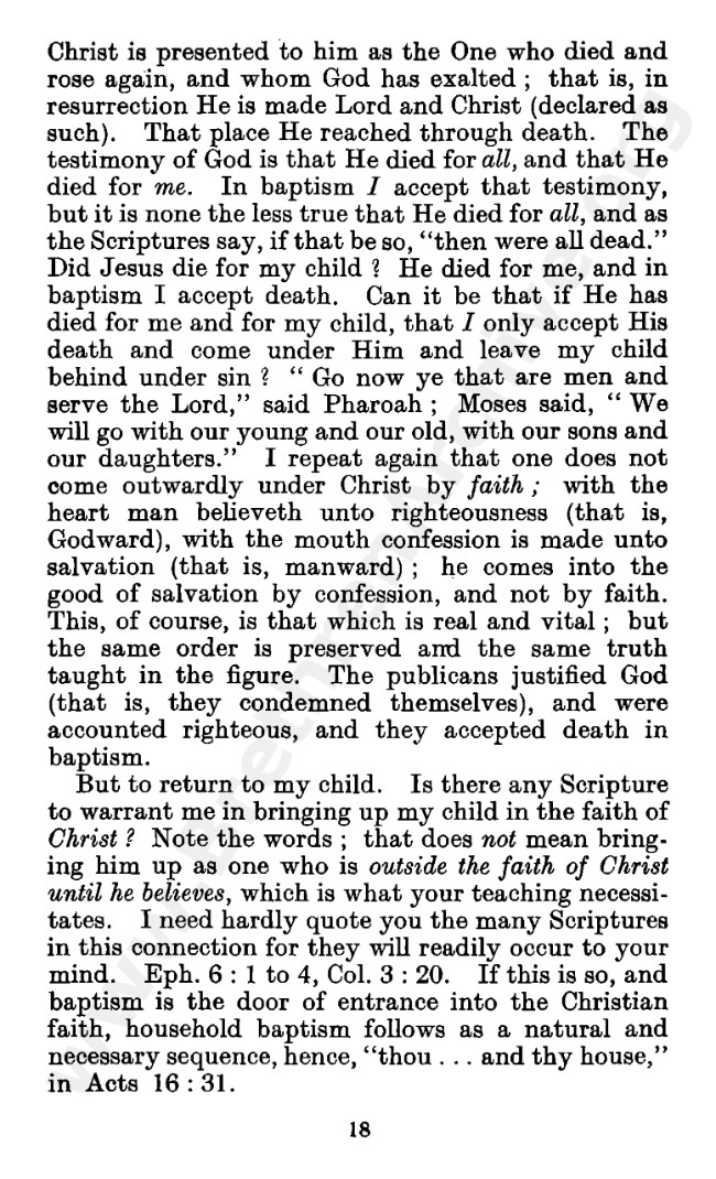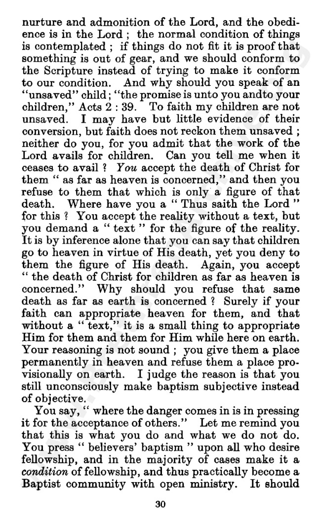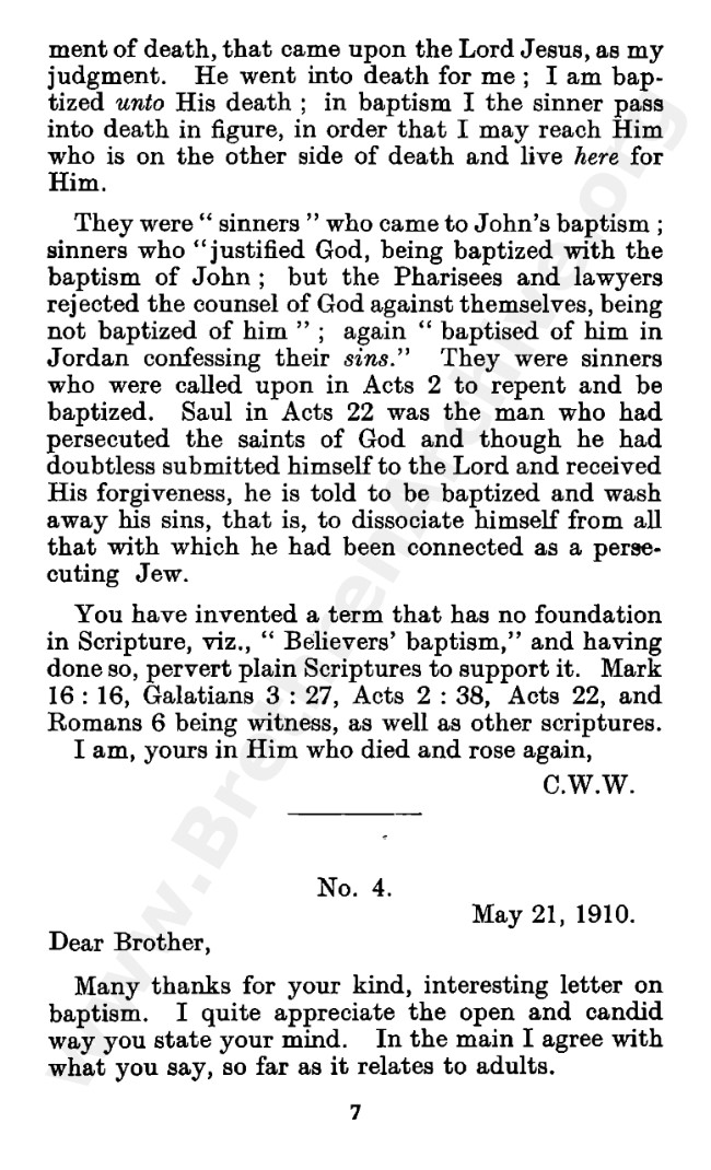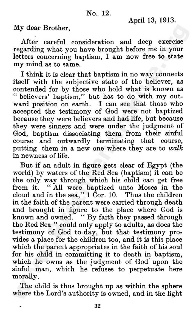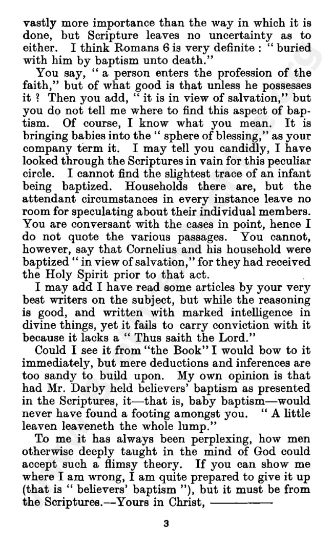 Well known pamphlet justifying 'Infant Baptism' (though they prefer to refer to it as 'Household Baptism'). Framed as a series of letters between an Exclusive, and an Open Brother (J. Collie Smith), with the OB being convinced in the end. See also http://www.christian-baptism.com/wycherley-response.htm