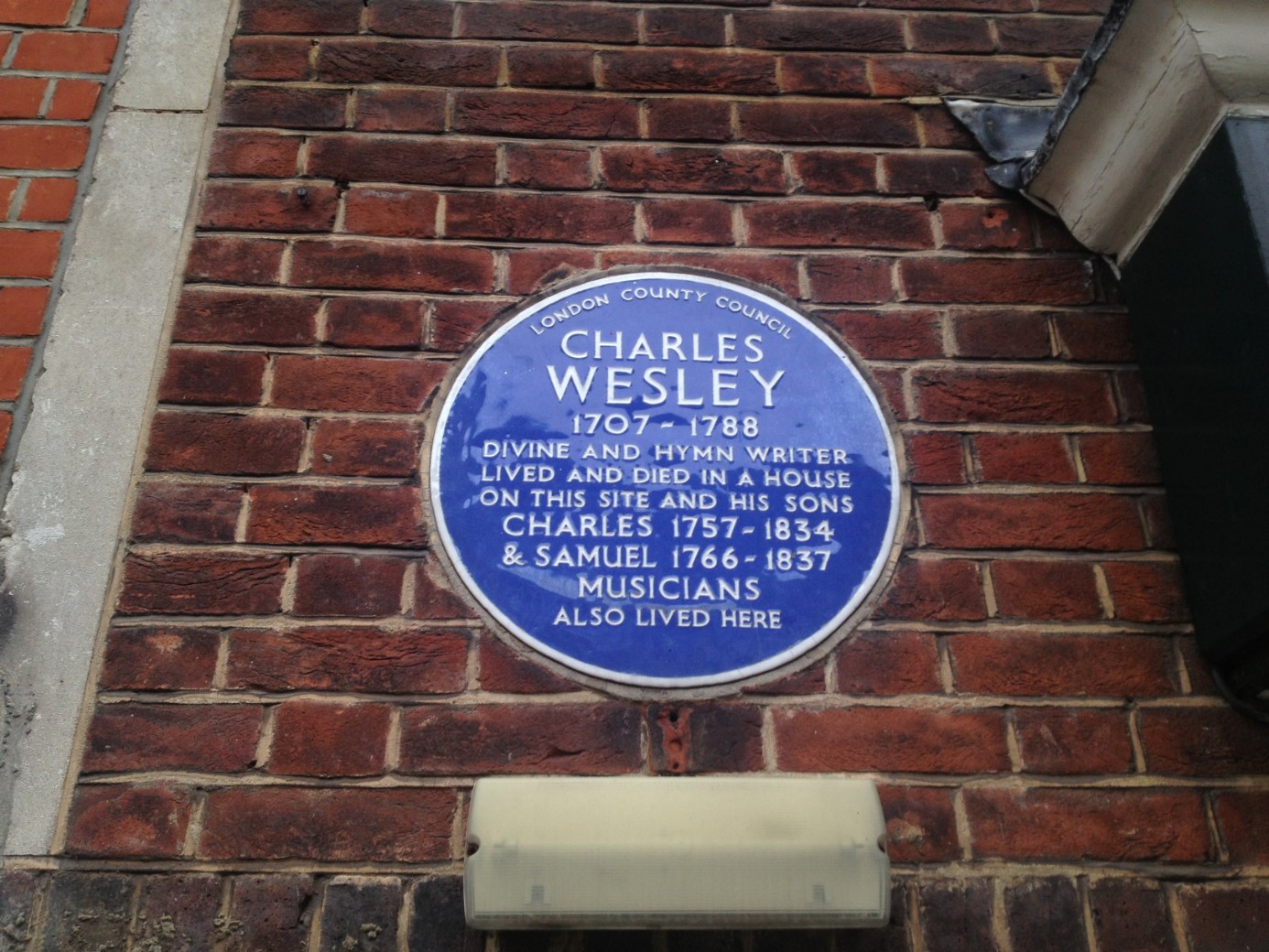 Situated in small memorial garden on the site of Old St Marylebone Church graveyard, indicating where Charles Wesley and members of his family are buried.
