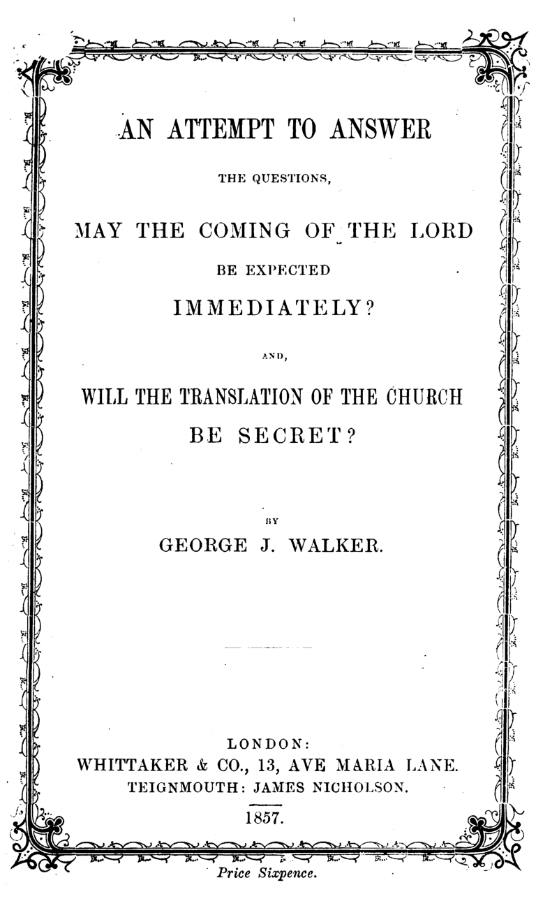 An Attempt to Answer the Questions, May the Coming of the Lord be Expected Immediately? and, Will the Translation of the Church be Secret?
