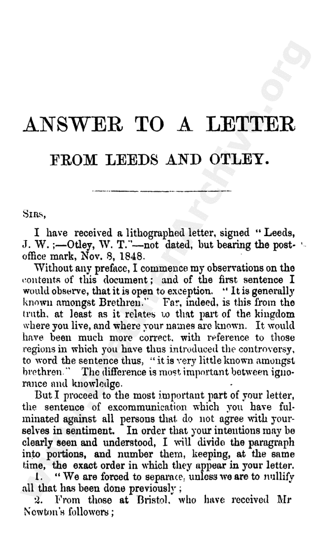 Answer to a letter from Leeds and Otley