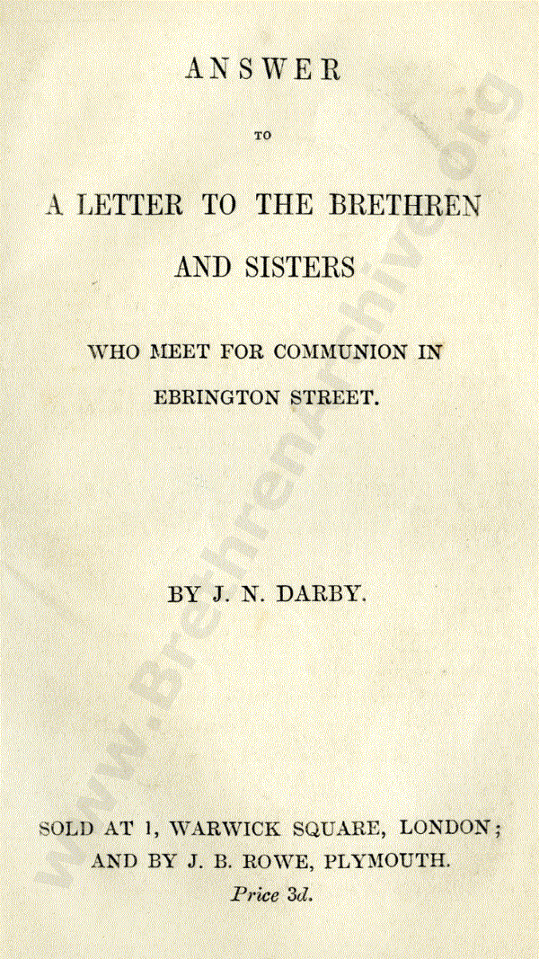 And he has practically taken his position in this letter on this principle. "I value the relation in which I stand to you as one of your teachers." That the author has been teaching in Ebrington Street, no one, of course, questions. Nor do I now enquire the least as to the value or otherwise of his teaching. But he stands in relation to them as one of their teachers, i.e., a teacher is not a joint in the body according to Ephesians 4 or 1 Corinthians 14, but a relationship to a particular set of saints. I am not here calling in question the existence of teachers in the church of God. I recognise them fully. But I find them in scripture in relationship to the body, one by the presence of the Holy Ghost on earth, and not to be a relationship with any given body of located saints, though they may happen to be located with them. I know that dissenters thus act on the principle of a given body having its members, and having their teacher or teachers. But in Scripture I find the teachers in the body of Christ, and members of the body of Christ. It is not my business now to discuss this with dissenting brethren; I am only getting at the fact.
