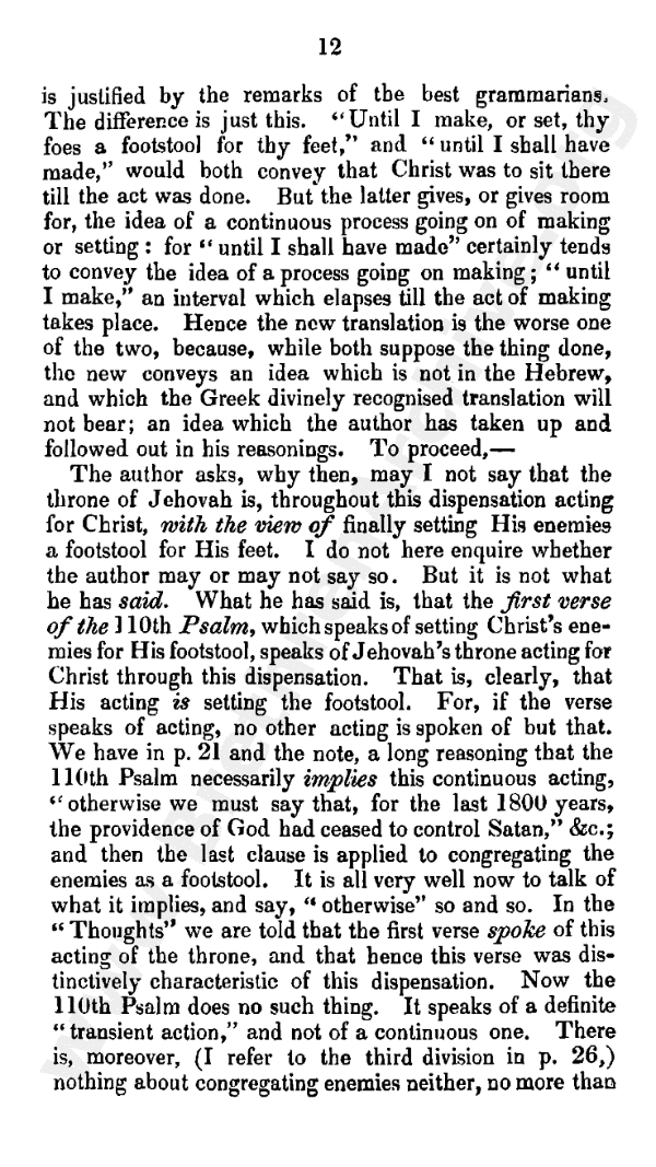 The difference is just this, "until I make, or set, thy foes a footstool for thy feet," and "until I shall have made" would both convey that Christ was to sit there till the act was done. But the latter gives, or gives room for, the idea of a continuous process going on of making or setting: for "until I shall have made" certainly tends to convey the idea of a process going on making; "until I make," an interval which elapses till the act of making takes place. Hence the new translation is the worse one of the two, because, while both suppose the thing done, the new conveys an idea which is not in the Hebrew, and which the Greek divinely recognised translation will not bear - an idea which the author has taken up and followed out in his reasonings. To proceed, the author asks, Why then, may I not say that the throne of Jehovah is, throughout this dispensation, acting for Christ, with the view of finally setting His enemies a footstool for His feet? I do not here enquire whether the author may or may not say so; but it is not what he has said. What he has said is, that the first verse of Psalm 110, which speaks of setting Christ's enemies for His footstool, speaks of Jehovah's throne acting for Christ through this dispensation: that is, clearly, that His acting is setting the footstool. For, if the verse speaks of acting, no other acting is spoken of but that. We have in page 21 and the note, a long reasoning that Psalm 110 necessarily implies this continuous acting: "otherwise we must say that, for the last eighteen hundred years, the providence of God had ceased to control Satan," etc.; and then the last clause is applied to congregating the enemies as a footstool. It is all very well now to talk of what it implies, and say "otherwise" so and so. In the "Thoughts" we are told that the first verse spoke of this acting of the throne, and that hence this verse was distinctively characteristic of this dispensation. Now Psalm 110 does no such things. It speaks of a definite "transient action," and not of a continuous one. There is, moreover (I refer to the third division in page 26), nothing about congregating enemies either, any more than forming or preparing the footstool. There is just simply setting or putting His enemies for His footstool.
