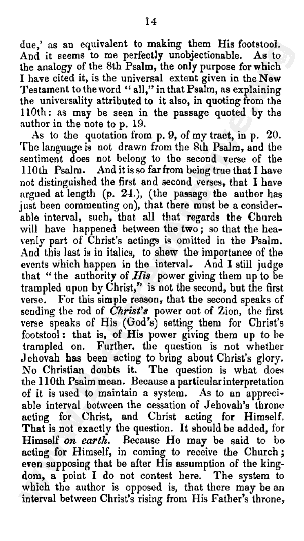 As to the quotation from page 11 of my tract in page 20, the language is not drawn from Psalm 8, and the sentiment does not belong to verse 2 of Psalm 110. And it is so far from being true that I have not distinguished between verses 1 and 2, that I have argued at length (page 30 - the passage the author has just been commenting on), that there must be a considerable interval, such that all that regards the church will have happened between the two; so that the heavenly part of Christ's actings is omitted in the psalm. And this last is in italics, to shew the importance of the events which happen in the interval. And I still judge that "the authority of His power giving them up to be trampled upon by Christ" is not verse 2, but verse I. For this simple reason, that verse 2 speaks of sending the rod of Christ's power out of Zion; verse I speaks of His (God's) setting them for Christ's footstool (that is, of His power giving them up to be trampled on). Further, the question is not whether Jehovah has been acting to bring about Christ's glory; no Christian doubts it.