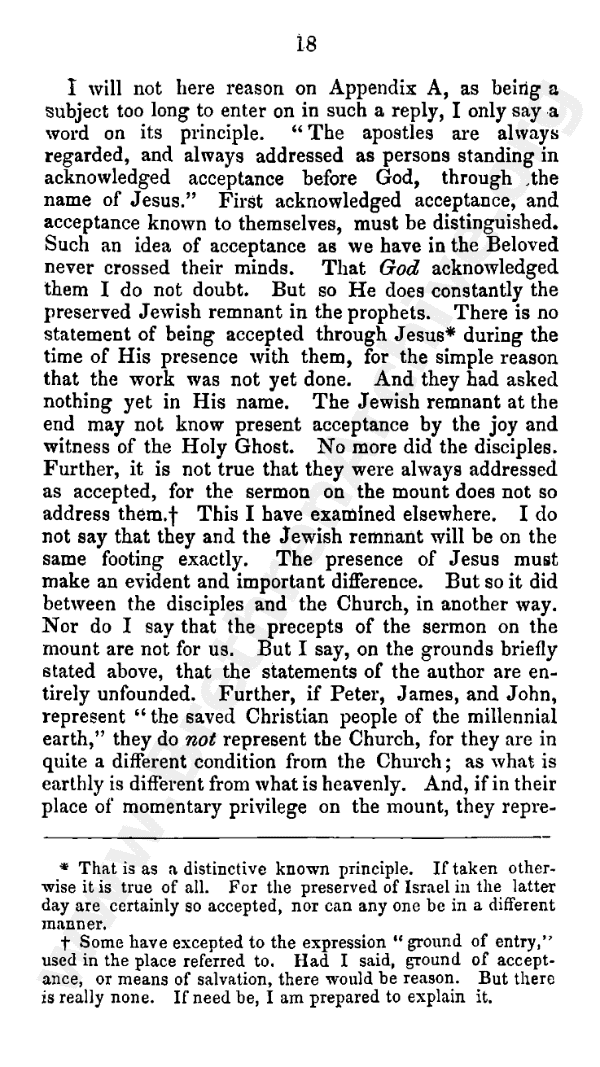 I will not here reason on Appendix A, as being a subject too long to enter on in such a reply, I only say a word on its principle. "The apostles are always regarded and always addressed as persons standing in acknowledged acceptance before God through the name of Jesus." First, acknowledged acceptance, and acceptance known to themselves, must be distinguished. Such an idea of acceptance as we have in the Beloved never crossed their minds. That God acknowledged them I do not doubt. But so He does constantly the preserved Jewish remnant in the prophets. There is no statement of being accepted through Jesus* during the time of His presence with them, for the simple reason that the work was not yet done. And they had asked nothing yet in His name. The Jewish remnant at the end may not know present acceptance by the joy and witness of the Holy Ghost. No more did the disciples Further, it is not true that they were always addressed as accepted; for the sermon on the mount does not so address them.** This I have examined elsewhere. I do not say that they and the Jewish remnant will be on the same footing exactly. The presence of Jesus must make an evident and important difference But so it did between the disciples and the church, in another way Nor do I say that the precepts of the sermon on the mount are not for us. But I say, on the grounds briefly stated above, that the statements of the author are entirely unfounded Further, if Peter, James, and John, represent "the saved Christian people of the millennial earth," they do not represent the church, for they are in quite a different condition from the church; as what is earthly is different from what is heavenly. And, if in their place of momentary privilege on the mount they represented them, the natural conclusion would be that they represented them in their place of faithfulness before the glory.