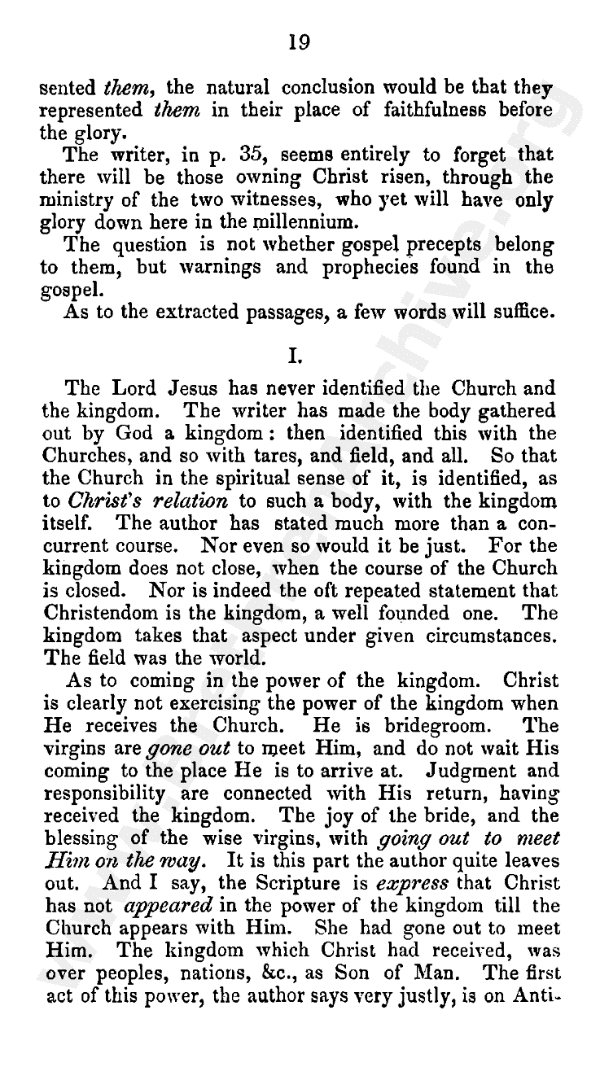 As to coming in the power of the kingdom. Christ is clearly not exercising the power of the kingdom when He receives the church. He is Bridegroom. The virgins are gone out to meet Him, and do not await His coming to the place He is to arrive at. Judgment and responsibility are connected with His return, having received the kingdom; the joy of the bride, and the blessing of the wise virgins, with going out to meet Him on the way. It is this part the author quite leaves out And I say, the scripture is express that Christ has not appeared in the power of the kingdom till the church appears with Him. She had gone out to meet Him. The kingdom which Christ had received was over peoples, nations, etc., as Son of man. The first act of this power, the author says very justly, is on Antichrist.
