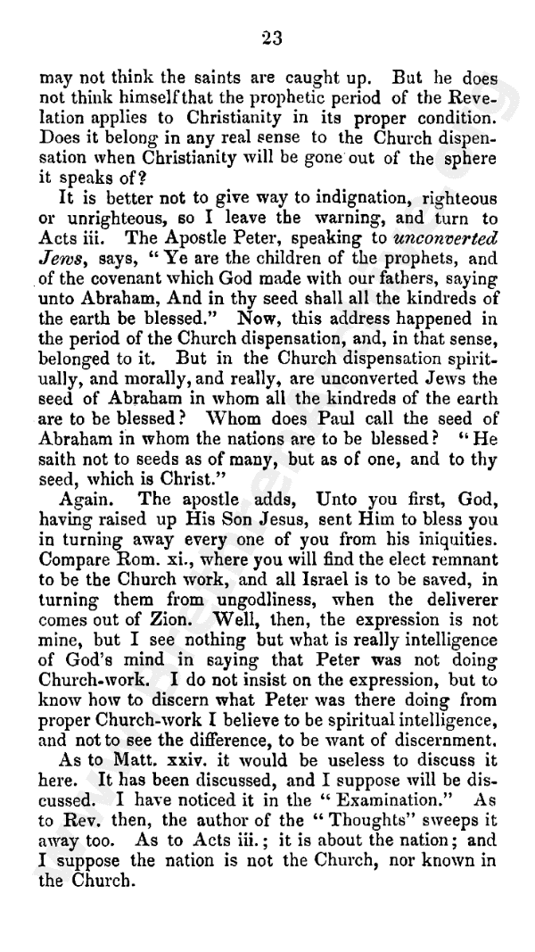 As to Matthew 24 it would be useless to discuss it here. It has been discussed, and I suppose will be discussed. I have noticed it in the "Examination." As to Revelation then, the author of the "Thoughts" sweeps it away too. As to Acts 3, it is about the nation; and I suppose the nation is not the church, nor known in the church.