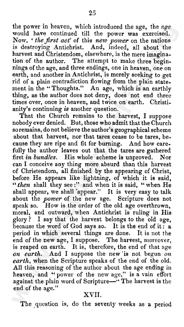 That the church remains to the harvest, I suppose nobody ever denied. But those who admit that the church so remains do not believe the author's geographical scheme about that harvest, nor that tares cease to be tares because they are ripe and fit for burning. And how carefully the author leaves out that the tares are gathered first in bundles ! His whole scheme is unproved. Nor can I conceive anything more absurd than this harvest of Christendom, all finished by the appearing of Christ, before He appears like lightning. It is said, "then shall they see": and it is said, "when he shall appear, then shall ye also appear." It is very easy to talk about the power of the new age. Scripture does not speak so. How is the order of the old age overthrown moral, and outward, when Antichrist is ruling in his glory? I say that the harvest belongs to the old age, because the word of God says so. It is the end of it - a period in which several things are done. It is not the end of the new age, I suppose. The harvest, moreover, is reaped on earth. It is, therefore, the end of that age on earth. And I suppose the new is not begun on earth, when the Scripture speaks of the end of the old. All this reasoning of the author about the age ending in heaven, and "power of the new age," is a vain effort against the plain word of Scripture - "The harvest is the end of the age."