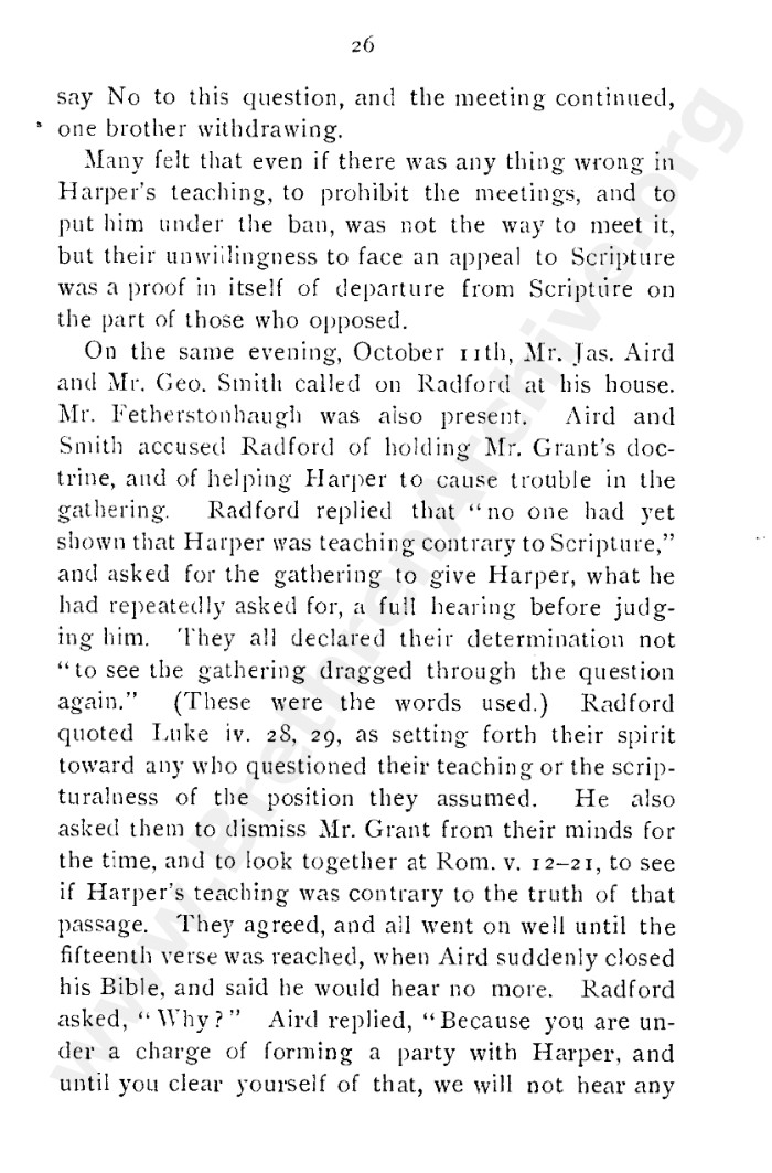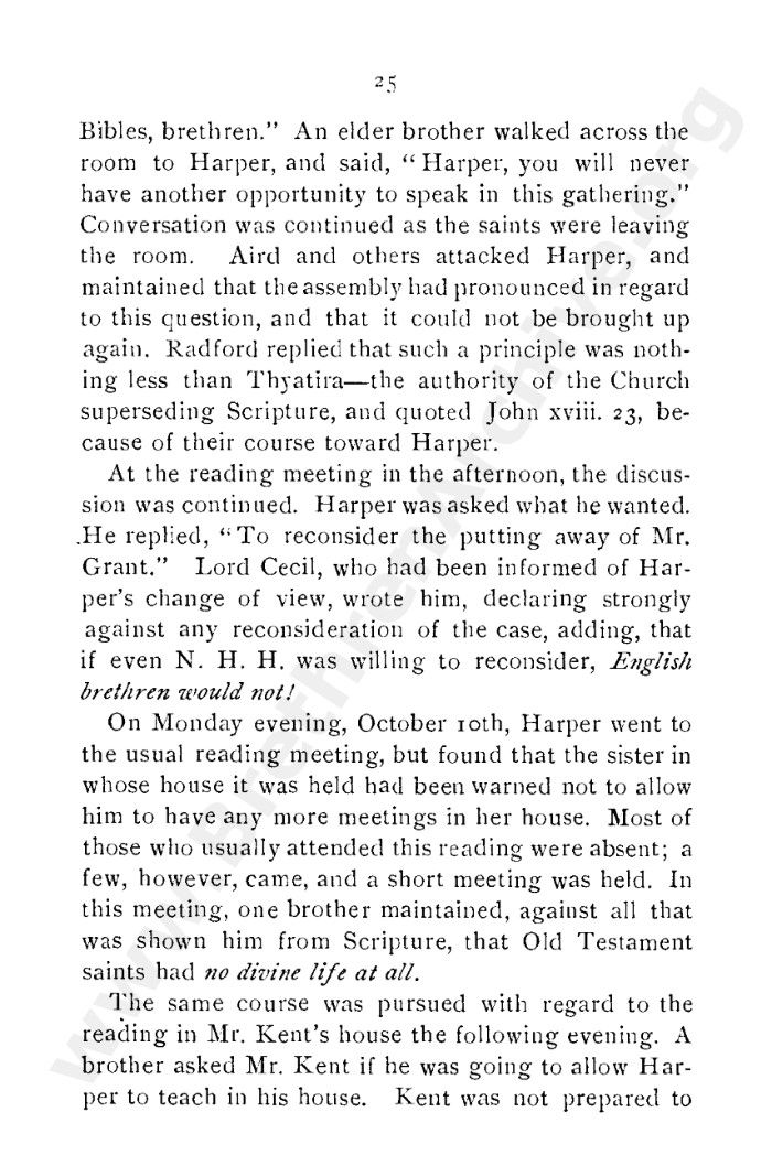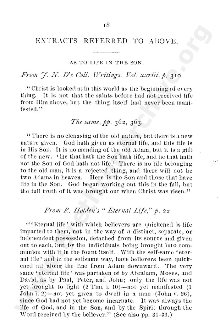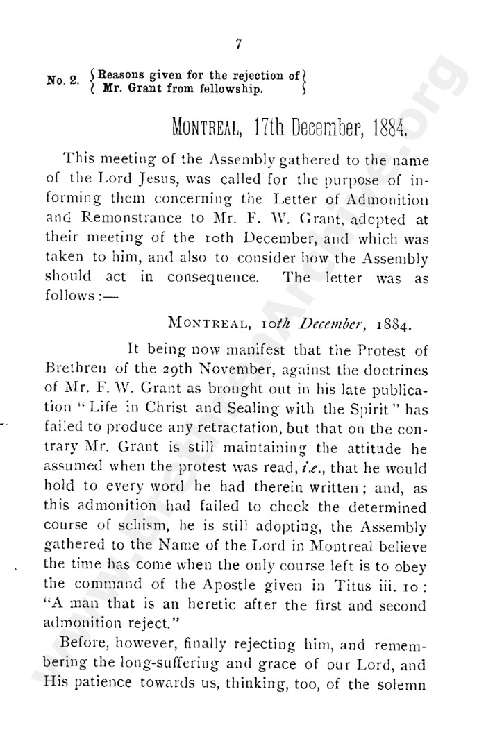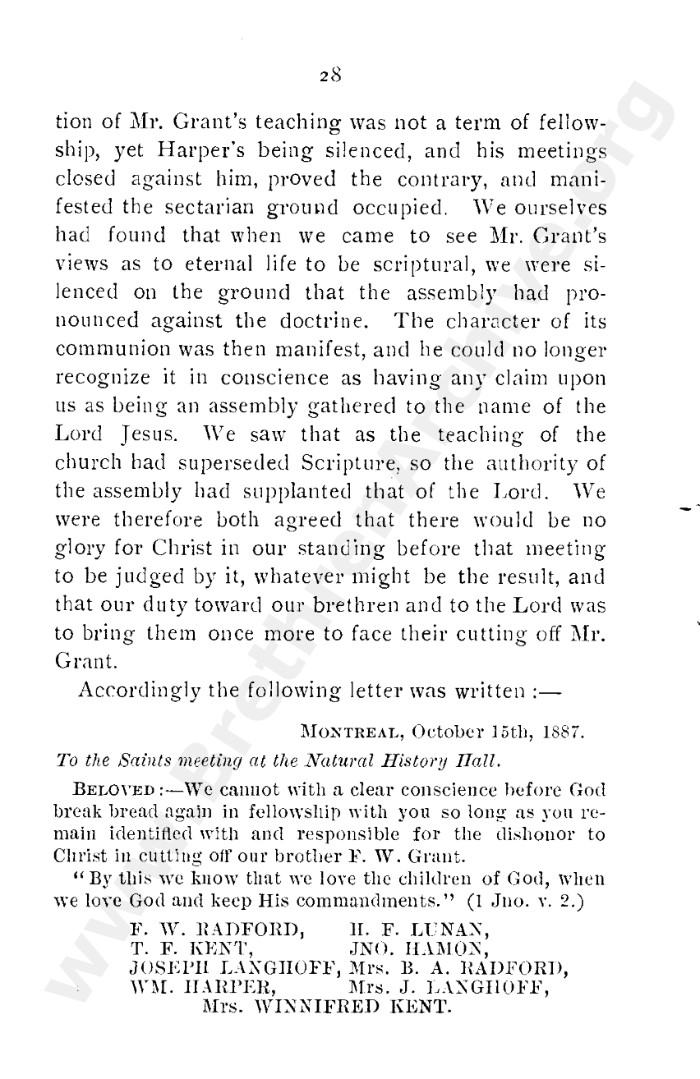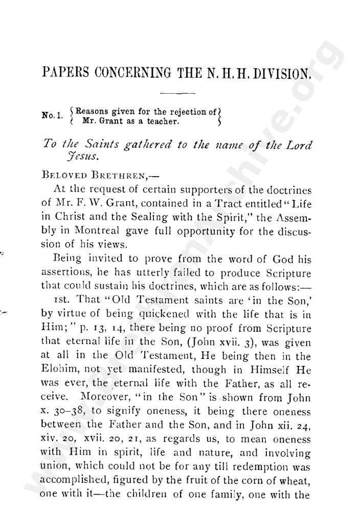 A collection of papers that gives good insight into what is known as the Grant division. Thankfully in the reunion between the Grant and Kelly-Lowe brethren, the KLC brethren were free to acknowledge this act was 'sin and unrighteousness'. Amazingly the TW brethren will still hold this was 'of God', but their ecclesiastical position necessitates them to and shows the falsehood of the whole thing. Particularly liked this on the last page: "At the judgement-seat of Christ you cannot, as so many of you do now, shelter yourselves by saying the assembly decided, and you could not but concur. This may quiet your conscience here, but there "every one of us shall give account of himself to God." "