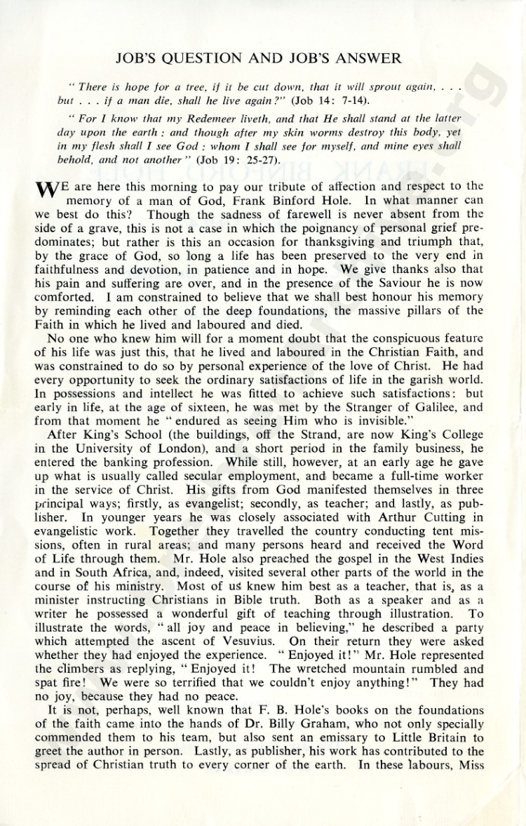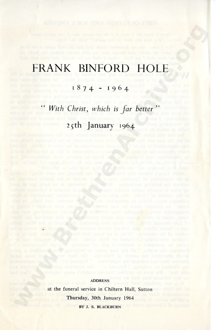 Frank Binford Hole - Address at Funeral