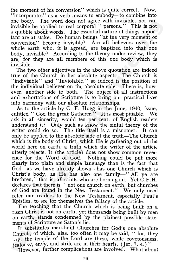 When the “separation” took place, not all who subscribed to “Needed Truth” ideas went out but continued to spread their church doctrine among OB. Among such teachers were A J Holiday and W H Hunter, both having been editors and contributors to “Needed Truth” magazine, the latter appearing to adhere to the whole concept. Taught in a convincing manner with the usual “we’re right and everybody else wrong” mentality (sadly an attitude which all the multiple factions of Plymouth Brethren have adopted), others took it on board, distorting the Scriptures to suit.