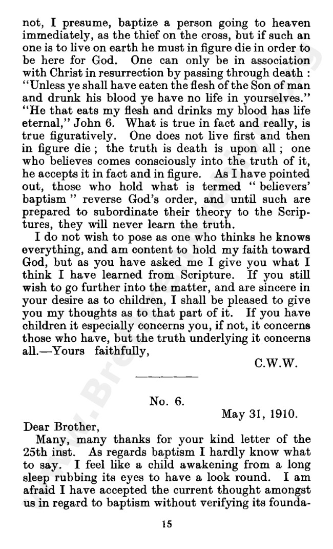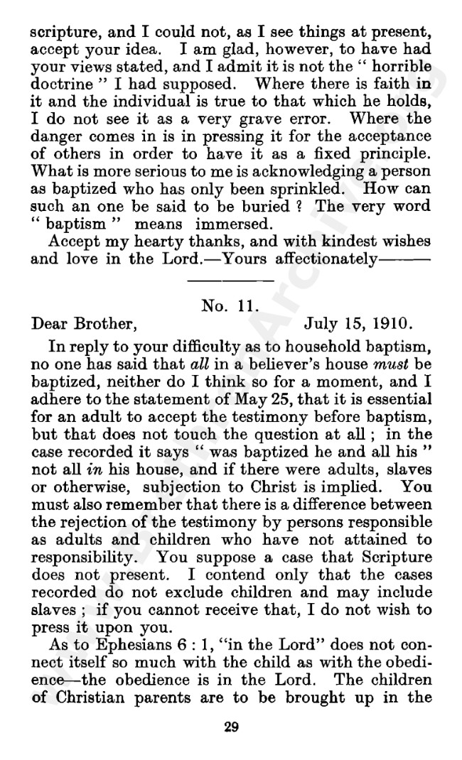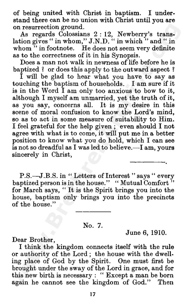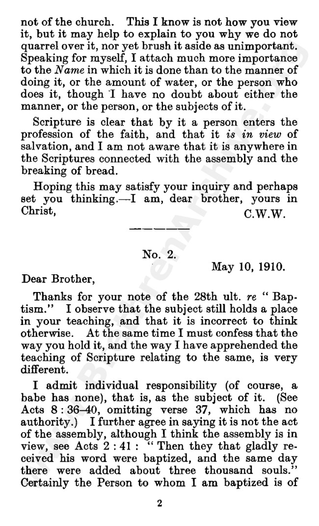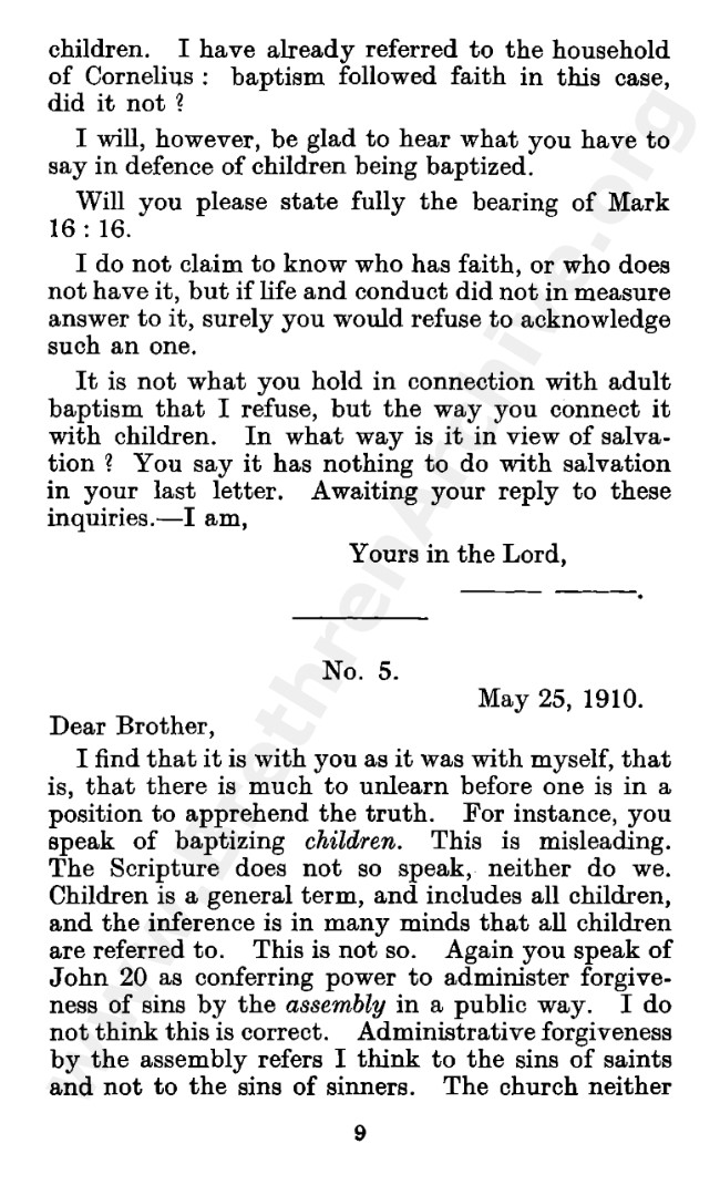 Well known pamphlet justifying 'Infant Baptism' (though they prefer to refer to it as 'Household Baptism'). Framed as a series of letters between an Exclusive, and an Open Brother (J. Collie Smith), with the OB being convinced in the end. See also http://www.christian-baptism.com/wycherley-response.htm