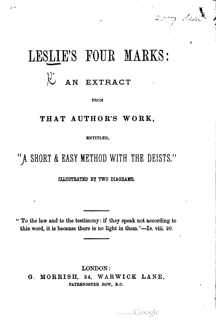 Leslie's Four Marks: An extract from that author's work, entitled, “A short and easy method with the Deists.” Illustrated by two diagrams. [Edited by Sir E. Denny.]