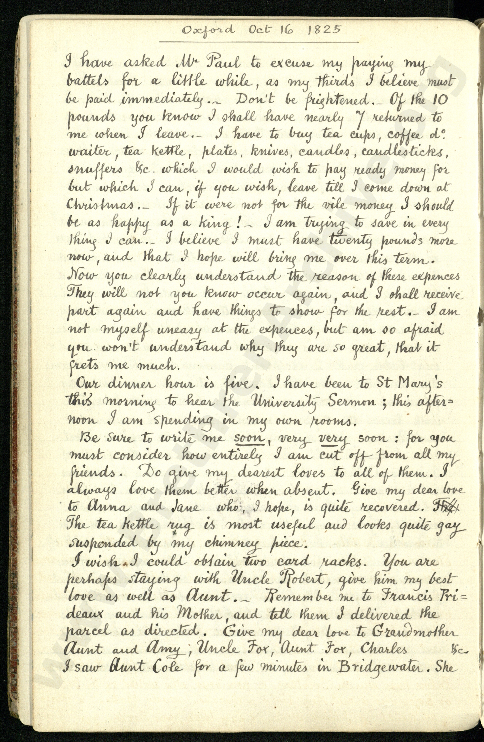 I have asked Mr. Paul to excuse my paying my battels for a little while, as my thirds I believe must be paid immediately. Don't be frightened of the 10 pounds you know I shall have nearly 7 returned to me when I leave. I have to buy tea cups, coffee do waiter, tea kettle, plates, knives, candles, candlesticks, snuffers etc. which I would wish to pay ready money for but which I can, if you wish, leave till I come down at Christmas. If it were not for the vile money I should be as happy as a king! I am trying to save in everything I can. I believe I must have twenty pounds more now, and that I hope will bring me over this term. Now you clearly understand the reason of these espenses. They will not you know occur again and I shall receive part again and have things to show for the rest. I am not myself uneasy at the expences, but am so afraid you won't understand why they are so great, that it frets me much.