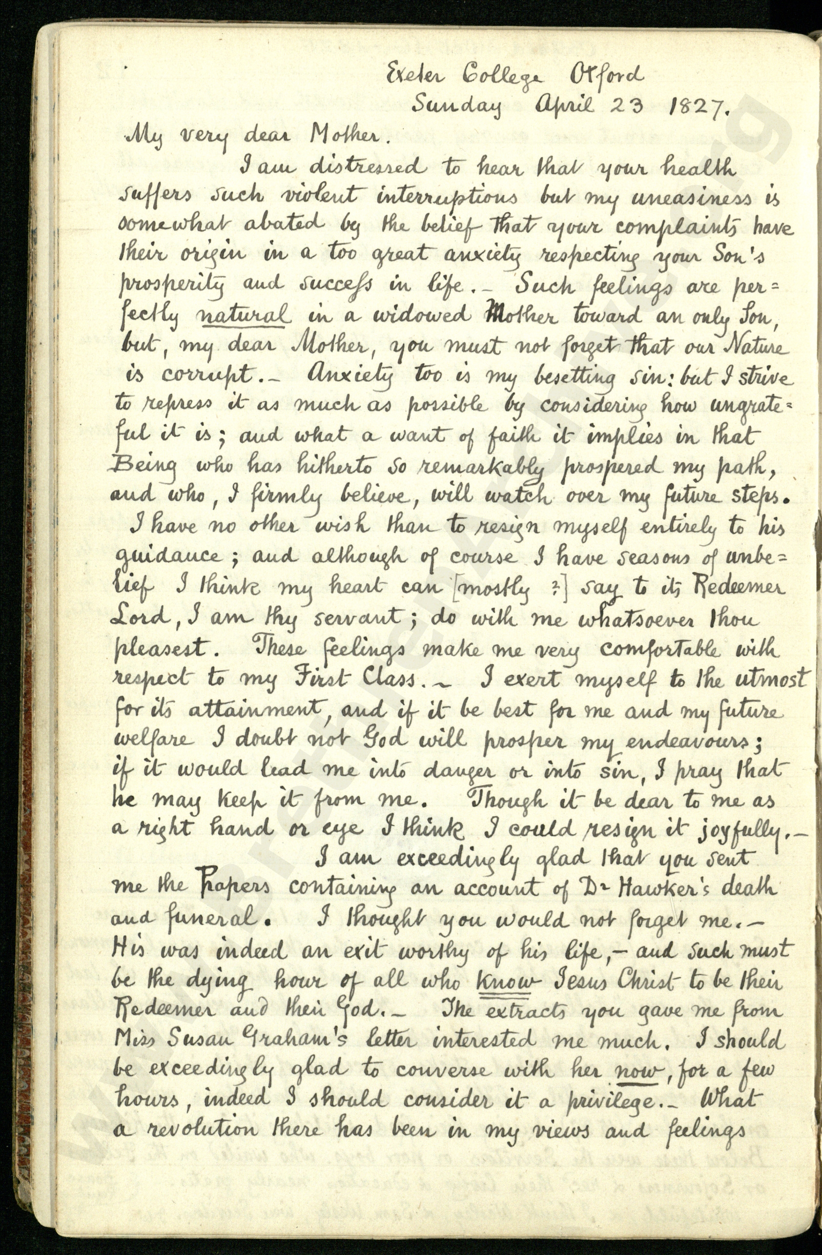 I am distressed to hear that your health suffers such violent interruptions but my uneasiness is somewhat abated by the belief that your complaints have their origin in a too great anxiety respecting you Son's prosperity and success in life. Such feelings are perfectly natural in a widowed Mother toward an only Son, but, my dear Mother, you must not forget that our Nature is corrupt. Anxiety too is my besetting sin: but I strive to repress it as much as possible by considering how ungrateful it is; and what a want of faith it implies in that Being who has hitherto so remarkably prospered my path, and who, I firmly believe, will watch over my future steps. I have no other wish than to resign myself entirely to his guidance; and although of course I have seasons of unbelief I think my heart can [mostly?] say to its Redeemer Lord, I am thy servant; do with me whatsoever thou pleasest. These feelings make me very comfortable with respect to my First Class. I exert myself to the utmost for its attainment, and if it be best for me and my future welfare I doubt not God will prosper my endeavours; if it would lead me into danger or into sin, I pray that he may keep it from me. Though it be dear to me as a right hand or eye I think I could resign it joyfully.
