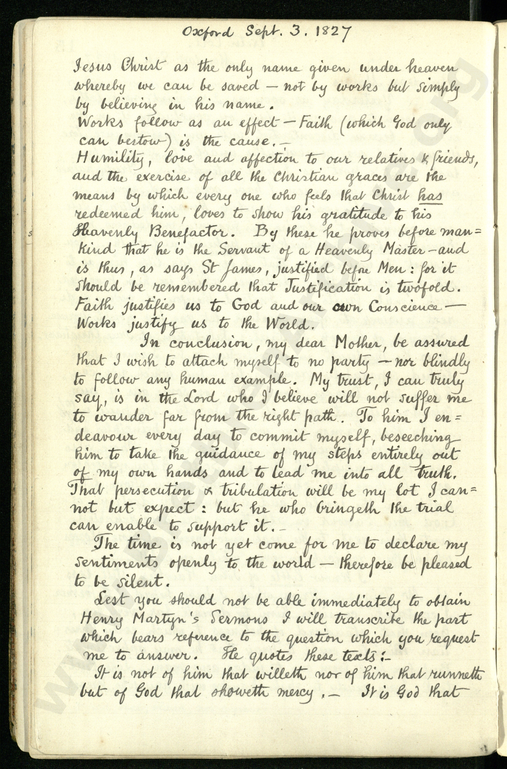 In conclusion, my dear Mother, be assured that I wish to attach myself to no party - nor blindly to follow any human example. My trust, I can truly say, is in the Lord who I believe will not suffer me to wander far from the right path. To him I endeavour every day to commit myself, beseeching Him to take the guidance of my steps entirely out of my own hands and to lead me into all Truth. That persecution and tribulation will be my lot I cannot but expect: but he who bringeth the trial can enable to support it.