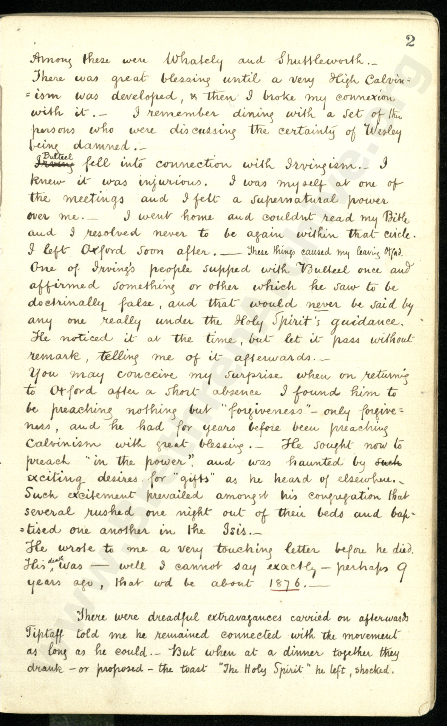 Among these were [Richard] Whately and [Philip] Shuttleworth. There was great blessing until a very High Calvinism was developed, and then I broke my connection with it. I remember dining with a set of the persons who were discussing the certainty of [John] Wesley being damned.