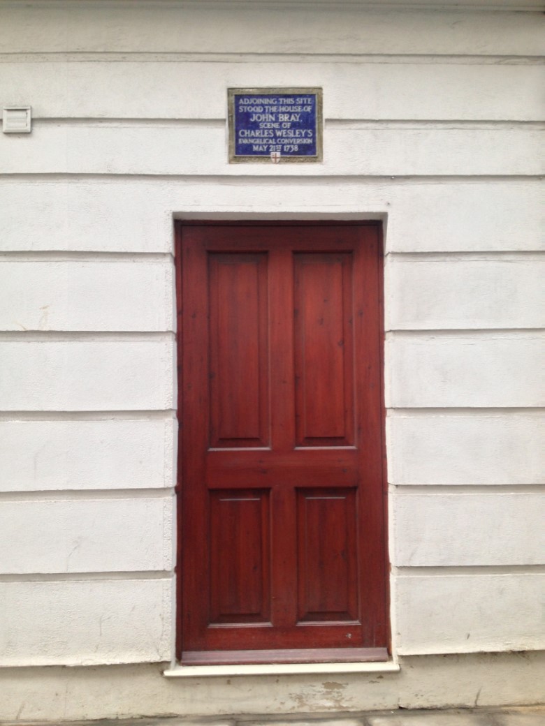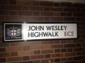 Just outside the Museum of London, in what was once Aldersgate, is a bronze memorial, commemorating the converstion of John Wesley, on May 24th 1738. John Wesley's evangelical conversion took place in a now-demolished Moravian Church believed to have been on this site. On the plaque is inscribed the passage from Wesley's diary that day.