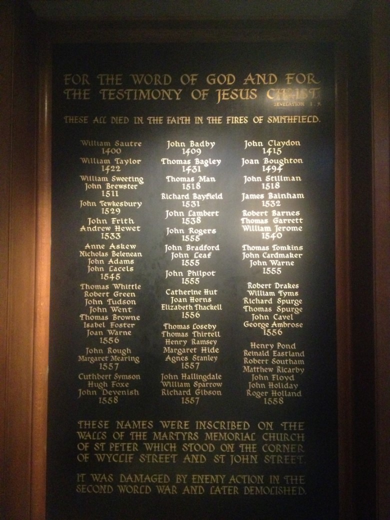 Smithfield, which is just a five minute walk from St Paul's Cathedral, has been the site of somoe of England's darkest days. During the reign of Mary, and at infrequent times previous to this, faithful witnesses to Christ, lost their lives in the flames here.