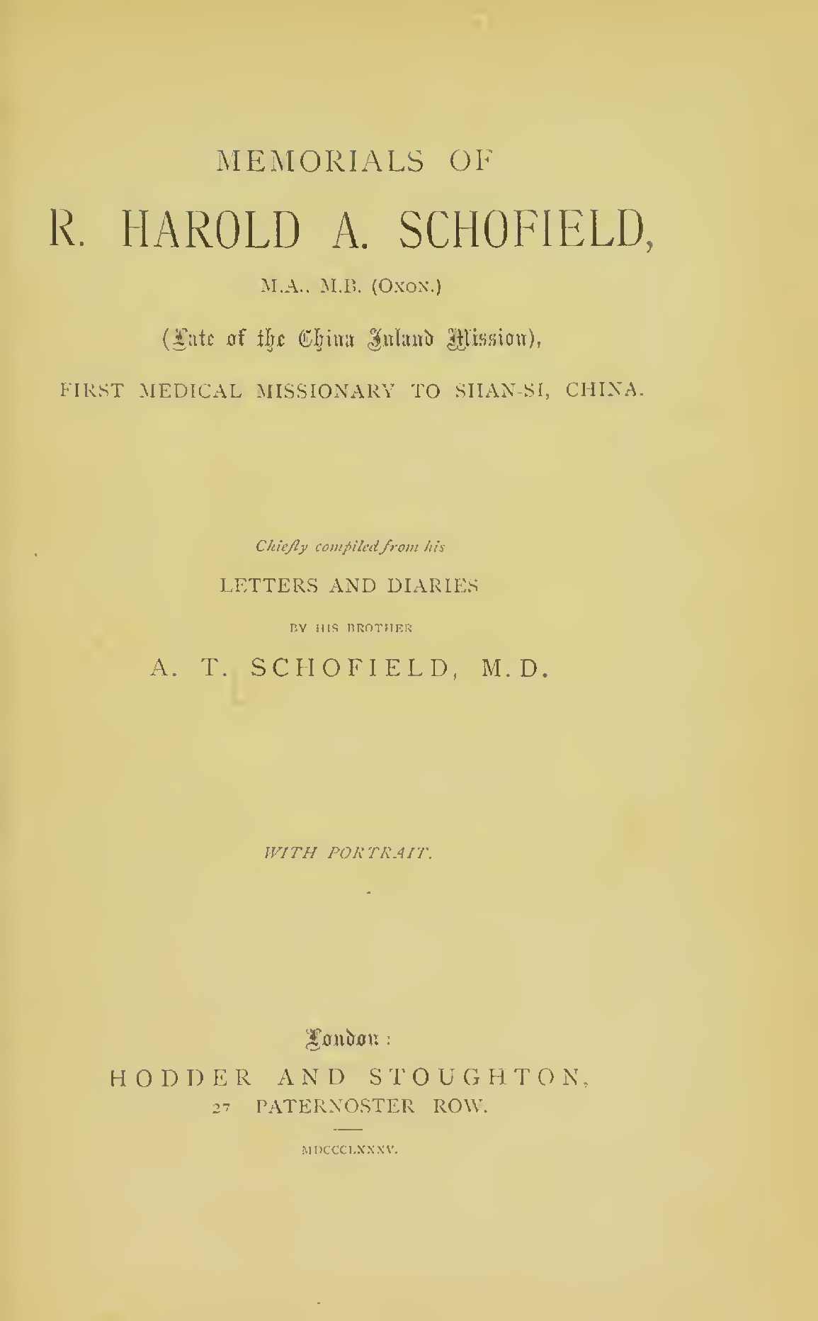 Memorials of R. Harold A. Schofield, M.A., M.B. (Oxon.) (late of China Inland Mission) : first medical missionary to Shan-Si, China
