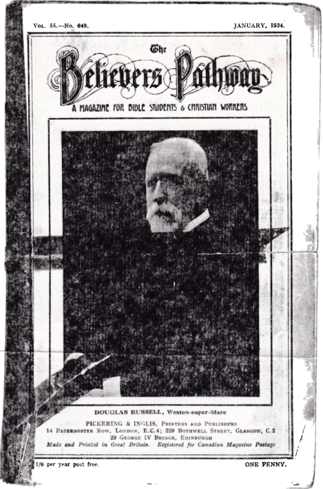 DOUGLAS RUSSELL, of Weston-super-Mare, passed Home to be with the Lord on Tuesday, November 14, [1933] at the ripe old age of ninety-one. Mr. Russell was born October 8, 1842, at Old Cumnock, Ayrshire. He was converted when a youth of nineteen, at a time of general awakening in Scotland. His first spiritual impressions were received through the ministry of Edward Payson Hammond, of the United States, when on an evangelistic visit to Great Britain. By this time, young Douglas Russell had been apprenticed to the Law, but the doctrines of free grace had taken such a grip of his young soul that he decided to step out as an evangelist to preach God's good news far and wide. Possessing a pleasing personality, fluent in speech, bright and kindly in manner, this youthful servant of Christ found everywhere a ready response to the Gospel message. In his evangelistic tours, he visited the United States and Canada, also Australia and New Zealand. Ever loyal to New Testament principles in worship and service, he always retained a love for all the Lord's people. He believed that wherever there is a sinner, there is the work of the evangelist, and wherever there is a saint, there is the work of the pastor or teacher, and he claimed perfect freedom in service for His worthy Lord. In his labours for the Lord, he has been associated with such men of God as Gordon Forlong, Harrison Ord, and others. Wherever he found an open door, he captured it for his Lord and the furtherance of His cause. Mr. Russell became acquainted with Messrs. Moody and Sankey on the American side, before those two God-sent evangelists paid their fruitful visits to Britain, and in the days of the Moody and Sankey revivals of 1873-1874 in this country, not only did he stand by them, but helped in some of their great missions, sometimes even leading the praise at the large gatherings.