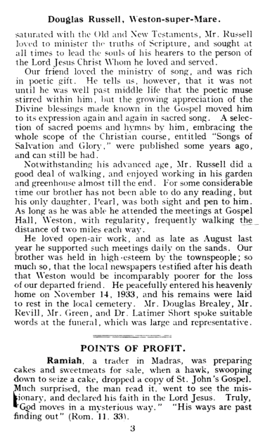 Notwithstanding his advanced age, Mr. Russell did a good deal of walking, and enjoyed working in his garden and greenhouse almost till the end. For some considerable time, our brother has not been able to do any reading, but his only daughter, Pearl, was both sight and pen to him. As long as he was able, he attended the meetings at Gospel Hall, Weston, with regularity, frequently walking the distance of two miles each way.