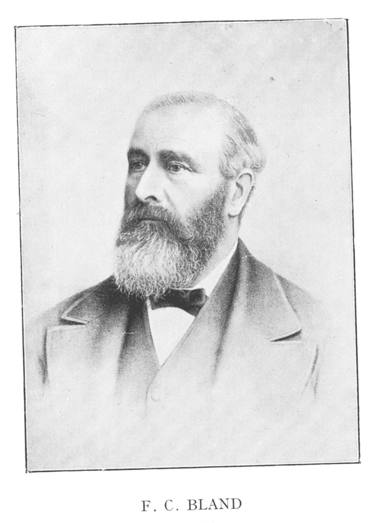 F. C. BLAND was born in 1826, at Derriquin, upon the Kenmare River, County Kerry, where his family had been settled for generations. His early life was spent in Ireland, and in due course he entered Trinity College, and received his degree in Arts from the University of Dublin. At the comparatively early age of twenty-three he married the lady who was in no mere conventional sense his companion and friend and fellow-helper through all the vicissitudes of five-and-forty years. On his marriage, Mr. Bland settled at Derriquin, devoting himself in part to the management of the estate, which, under his care, emerged from the barbarism in which many parts of Ireland were sunk at the time of the potato famine, and in part to the amusements and hospitalities of an Irish country gentleman in a county as noted then for its social pleasures as it is famous at all times for its extraordinary natural beauties. A man of commanding presence and charming address, Mr. Bland was a special favourite with his fellows, and among the tenantry his word was law. Throughout the estate, indeed, his rule was a "benevolent despotism." In 1859 he served the office of High Sheriff for Kerry, and at the time of the revival in the south of Ireland he held a prominent position among the gentry of the county.