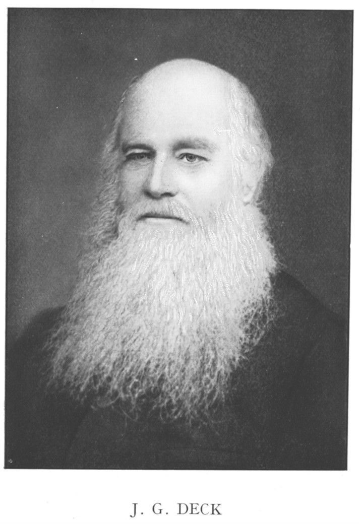 James George Deck, was born 1st November, 1807, at Bury St. Edmunds, Suffolk, and was blessed, like Timothy, with a praying mother, one who used to retire every evening to her room for a quiet hour with God on behalf of her children, and also of her children's children, and who never punished her children without first praying with them. All of her children were early converted and consecrated unto God; a blessing which has descended unto the third generation. One of her daughters, Mrs. M. J. Walker, was the authoress of "Jesus, I will trust Thee," "The wanderer no more will roam" (Believers Hymn Book, 286), besides other well-known hymns.