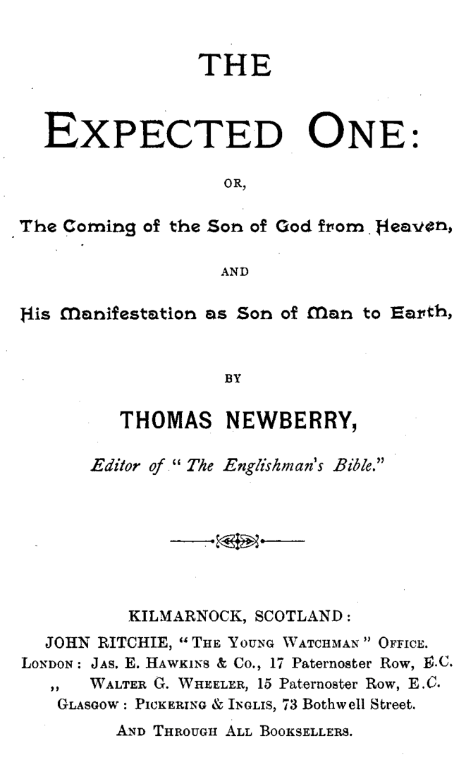The Expected One: or the Coming of the Son of God from Heaven, and his Manifestation as Son of Man to Earth