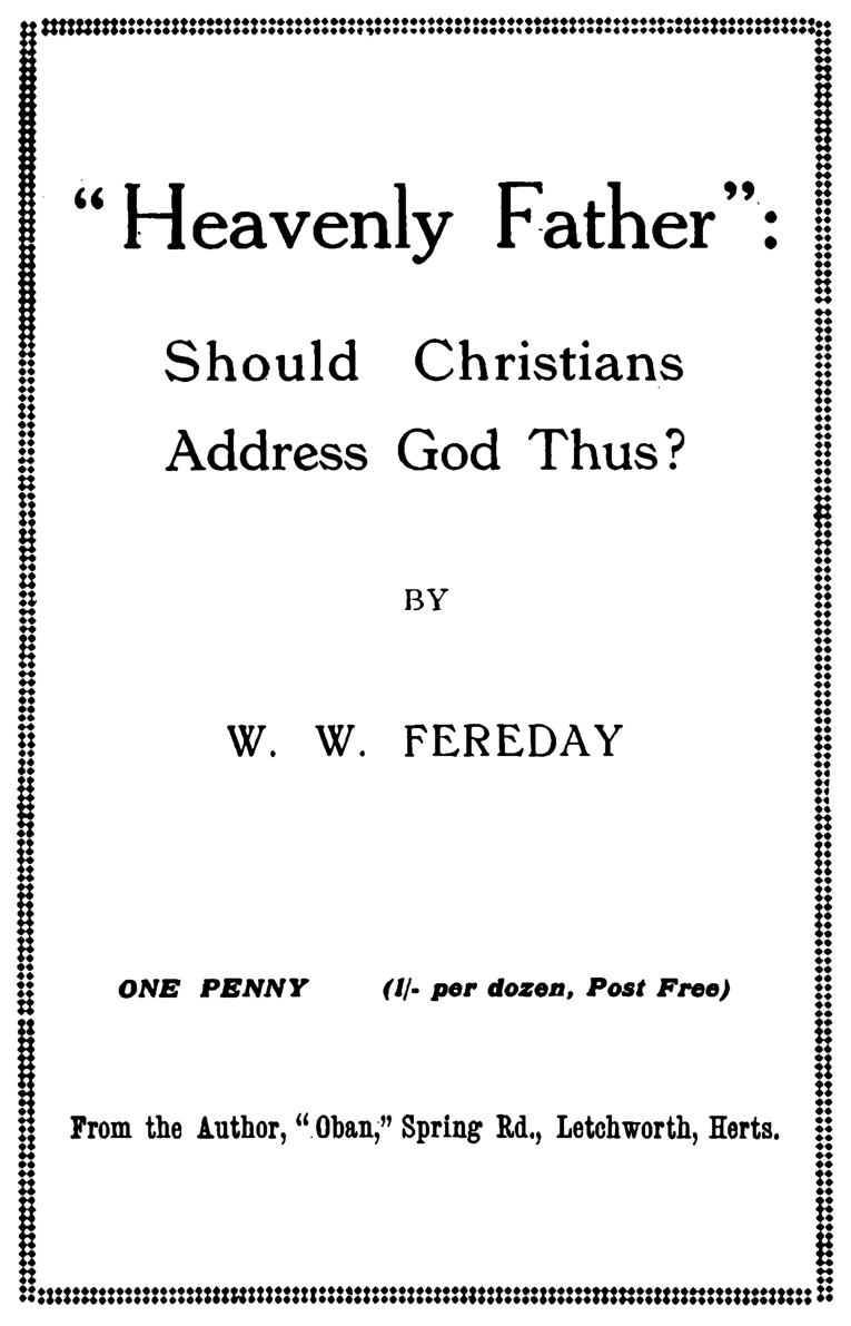 To continue from Comment here https://www.brethrenarchive.org/people/ww-fereday/, stories that I was told in 2003 by a brother who had known WWF. Once he was in hospital and another brother had payed him a visitation. Upon being about to leave, the brother asked if he could pray. Upon starting his prayer with the words "Our Heavenly Father ..", WWF interupted and said "If that is all you knoiw, you can stop there!"